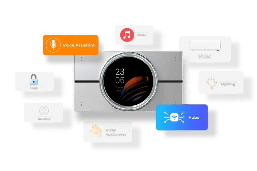 Akubela HyPanel Lux is designed to grow with your lifestyle. Whether you’re adding a security camera after welcoming children or expanding your smart setup, Lux adapts effortlessly. It supports Future Homes, ZigBee, Wi-Fi, Bluetooth, Ethernet, and IR remote control, connecting you to a wide range of smart devices and traditional appliances for a truly integrated home experience.